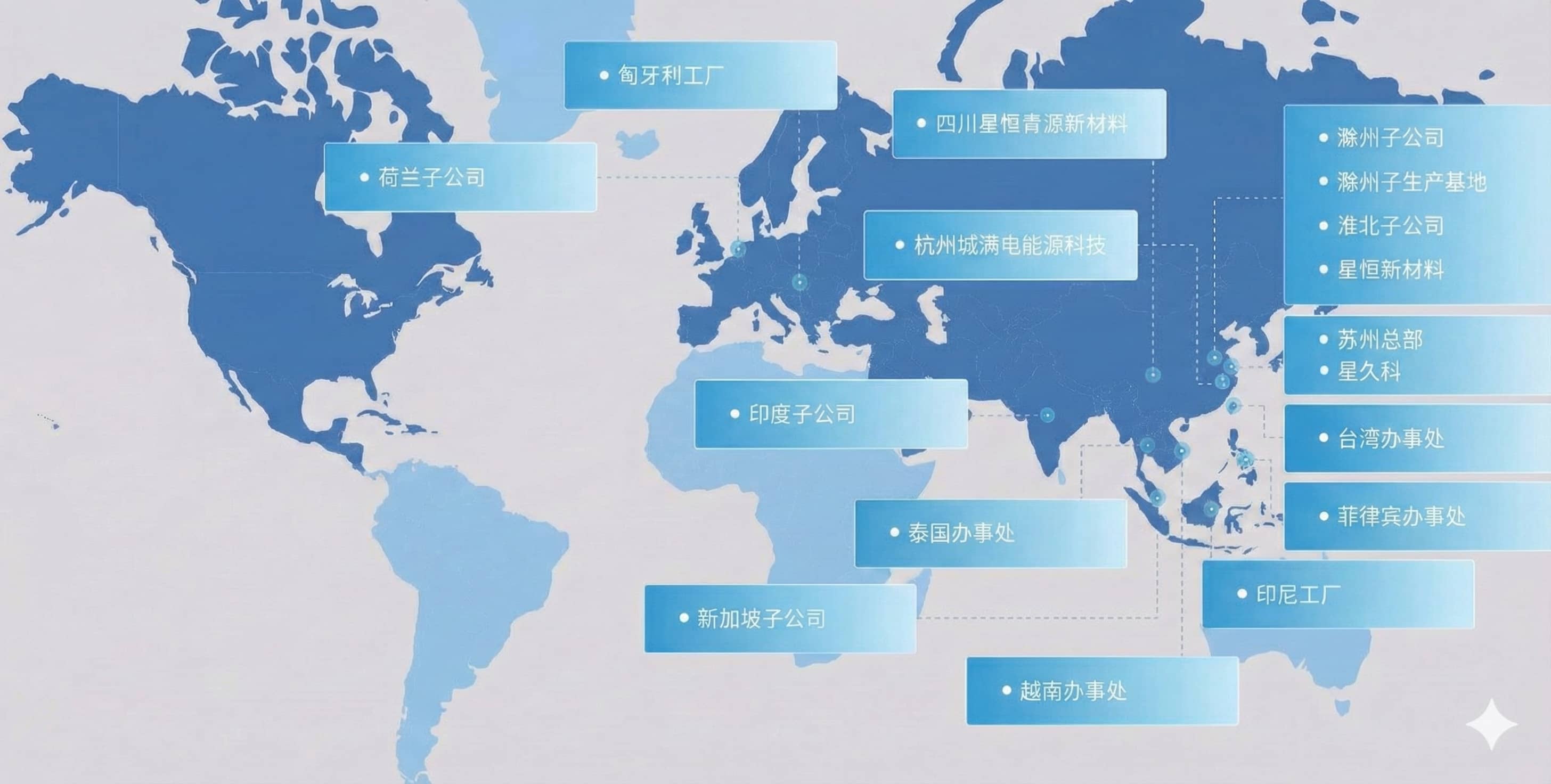 歷經20余年發展,星恒已開展全球化產業布局,擁有蘇州、滁州、印尼、匈牙利等生產基地,歐洲、印度、東南亞、新加坡等子公司。同時布局電池原材料業務“星恒青源”、電池運營品牌“城滿電”和電池回收業務“星恒新材料”,開啟全產業鏈生態進化。產品主要用于電動汽車、儲能、電動輕型車等新能源領域。