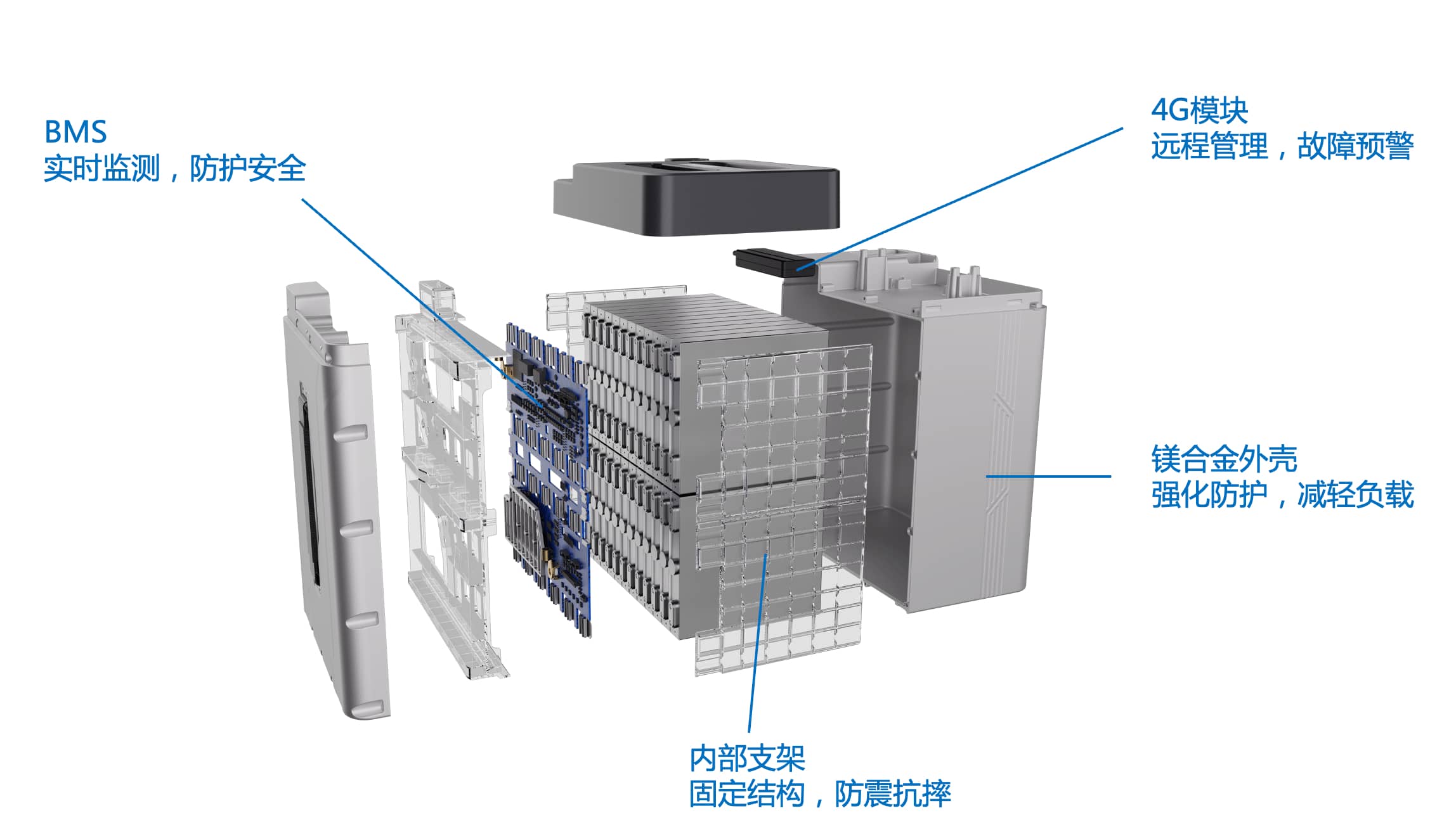 電芯、模組、電池包采用高強(qiáng)度、輕量化材料設(shè)計(jì),輕巧、堅(jiān)固、耐用一體融合