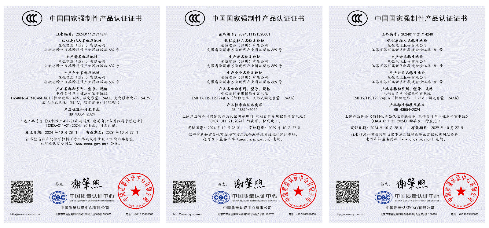 星恒電源積極響應管理要求,根據認證標準,全面提升制造工藝、產品設計及安全性能等相關要素,率先通過了GB 43854國家強制標準,并向中國質量認證中心申請產品CCC認證。