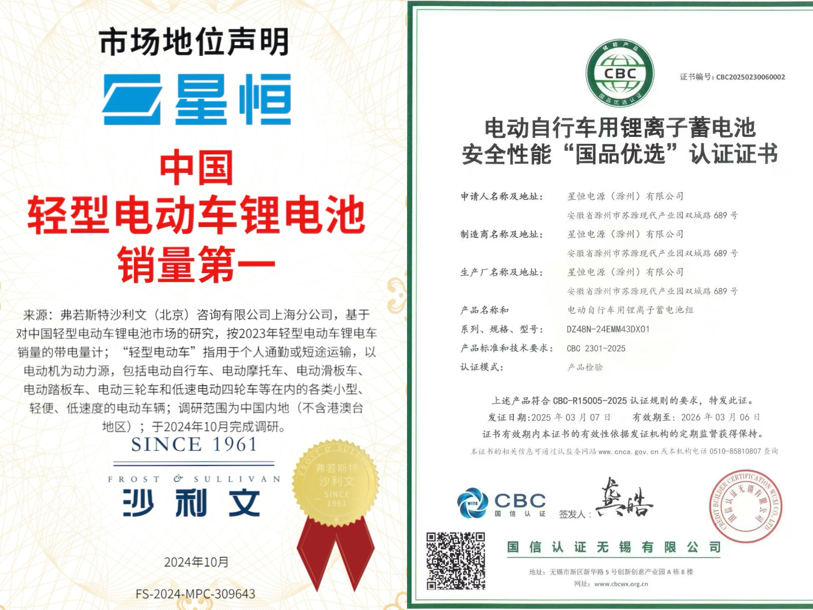 星恒鋰電池對品質(zhì)與安全的極致苛求,贏得了權(quán)威認(rèn)可——榮獲由全球著名市場研究機構(gòu)弗若斯特沙利文頒發(fā)的“中國輕型電動車鋰電池銷量第一”市場地位證書,以及國信認(rèn)證(CBC)頒發(fā)的行業(yè)首張電動自行車用鋰離子蓄電池安全性能“國品優(yōu)選”認(rèn)證證書。這些極具含金量的證書,是星恒匠心制造與可靠品質(zhì)最權(quán)威的實力勛章。