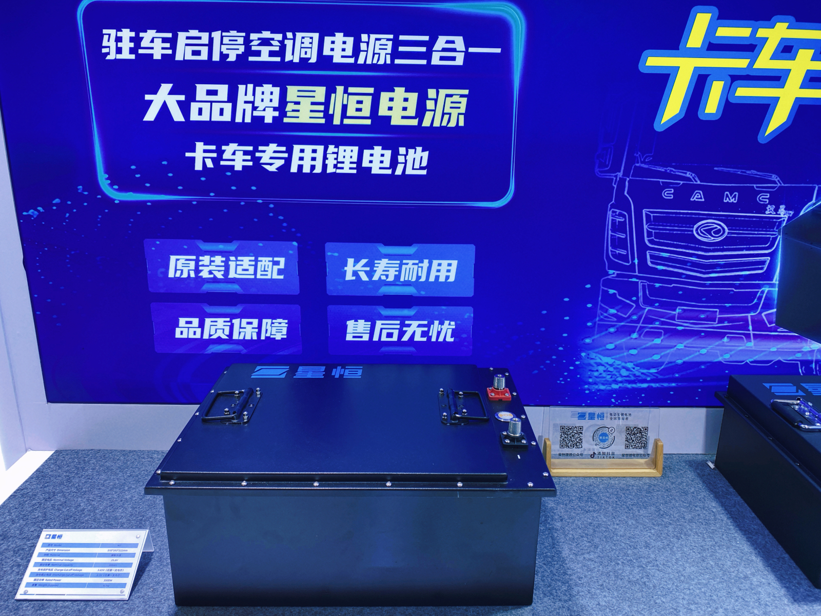 如果說高能鐵鋰電芯是內在的“強健心臟”,那么現場展出的24V汽車啟停電池便是守護卡車征程的“全能鎧甲”。星恒此次重點展示了M5(200Ah)和 M7(300Ah)兩款型號,專為卡車的嚴苛供電場景設計,集啟停、駐車空調、生活用電等多功能于一體,堪稱卡車司機的“移動能源中心”。